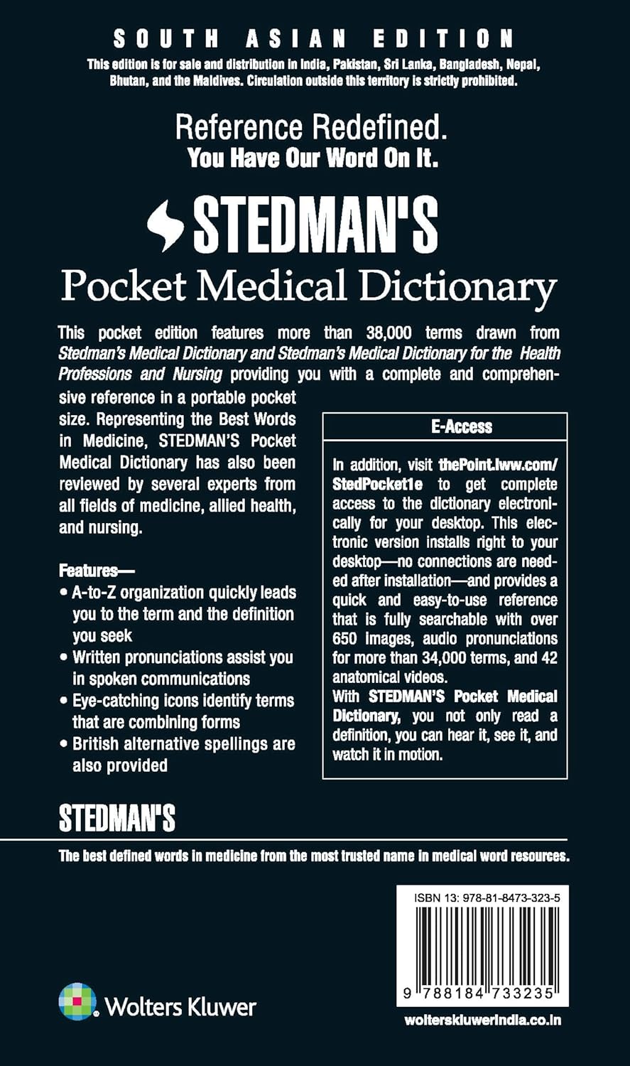 This pocket edition features more than 38, 000 terms drawn from Stedman's Medical Dictionary for the Health Professions and Nursing, Sixth Edition and Stedman's Medical Dictionary, Twenty-Eighth Edition, providing readers with a complete and comprehensive reference in a portable size. Features and A-to-Z