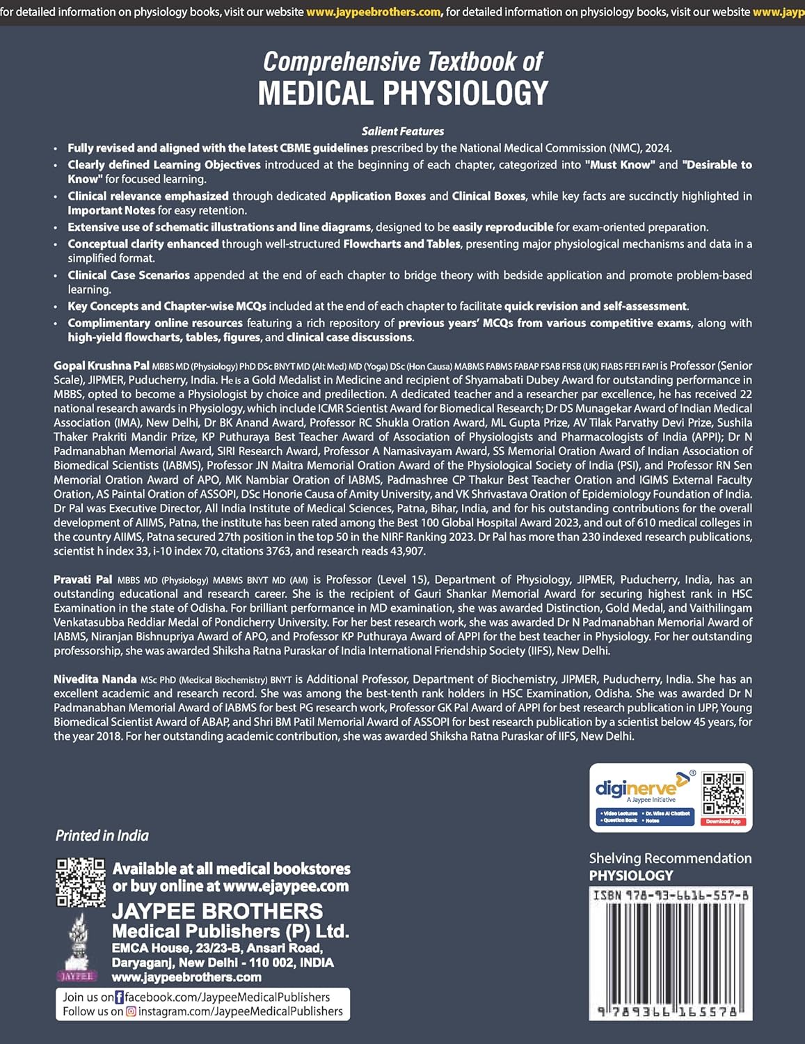 • Fully revised and aligned with the latest CBME guidelines prescribed by the National Medical Commission (NMC), 2024. • Clearly defined Learning Objectives introduced at the beginning of each chapter, categorized into "Must Know" and "Desirable to Know" for focused learning. • Clinical relevance emphasized through dedicated Application Boxes and Clinical Boxes, while key facts are succinctly highlighted in Important Notes for easy retention. • Extensive use of schematic illustrations and line diagrams, designed to be easily reproducible for exam-oriented preparation. • Conceptual clarity enhanced through well-structured Flowcharts and Tables, presenting major physiological mechanisms and data in a simplified format. • Clinical Case Scenarios appended at the end of each chapter to bridge theory with bedside application and promote problem-based learning. • Key Concepts and Chapter-wise MCQs included at the end of each chapter to facilitate quick revision and self-assessment. • Complimentary online resources featuring a rich repository of previous years' MCQs from various competitive exams, along with high-yield flowcharts, tables, figures, and clinical case discussions.