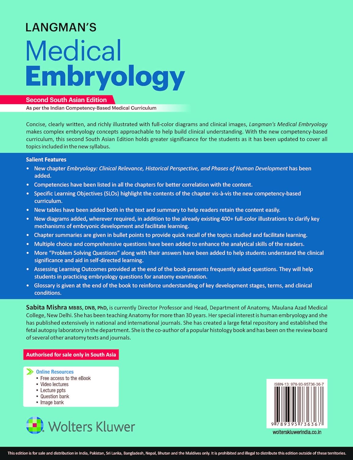 Concise, clearly written, and richly illustrated with full-color diagrams and clinical images, Langman's Medical Embryology, makes complex embryology concepts approachable to help build clinical understanding. With the new competency-based curriculum, this second South Asian Edition holds greater significance for the students as it has been updated to cover all topics included in the new syllabus